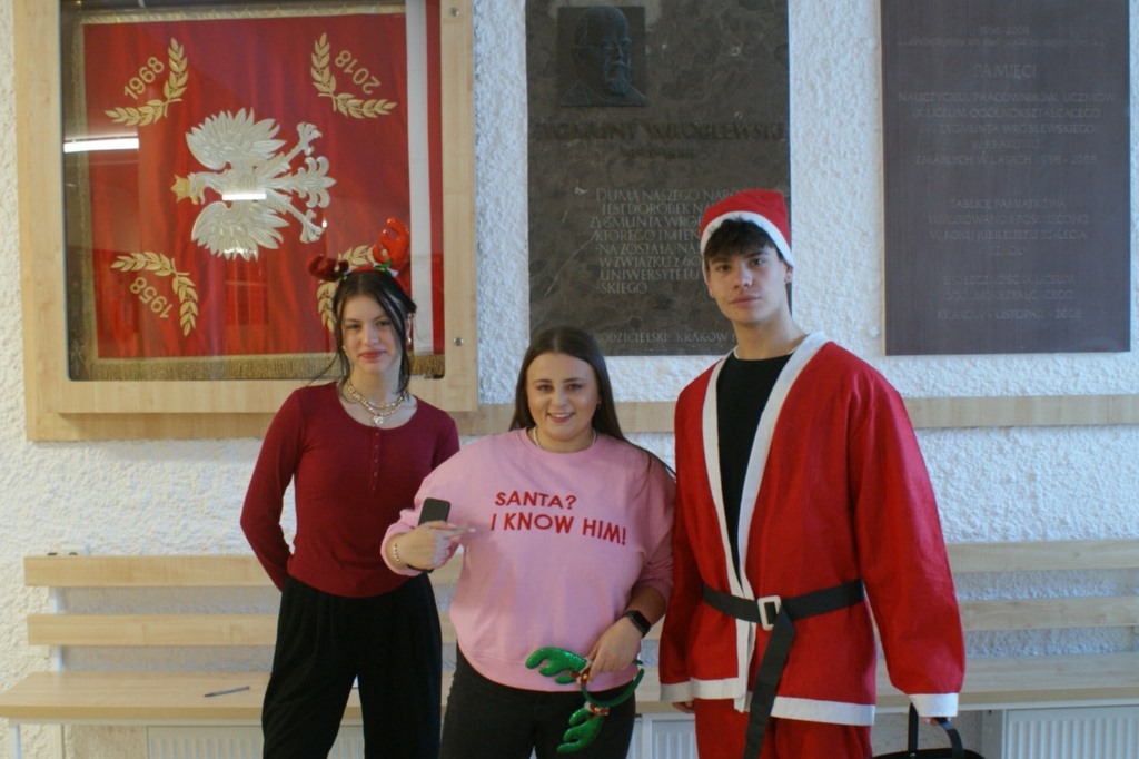 Dziękujemy tym, którzy ubrali się na czerwono lub założyli świąteczne dodatki. Wielu ubranych na czerwono Mikołajów i jego pomocników, którzy pojawili się na korytarzach IX LO, stworzyło mikołajkową atmosferę w szkole.