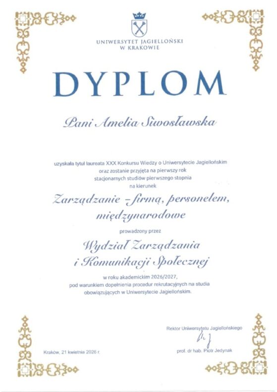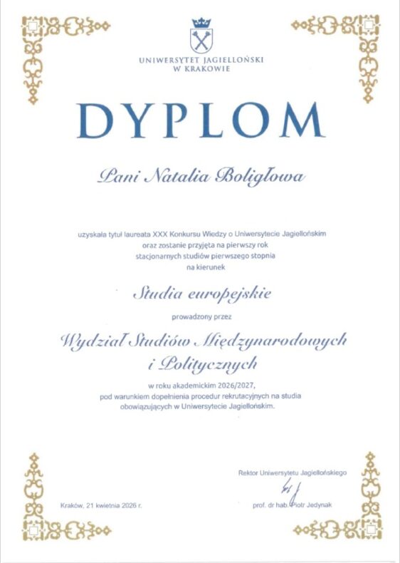 W dniu 21 kwietnia 2026 roku Amelia Siwosławska i Natalia Boligłowa, uczennice klasy. 4e (pol-hist-wos) zostały Laureatkami XXX Ogólnopolskiego Konkursu Wiedzy o Uniwersytecie Jagiellońskim i w nagrodę otrzymały indeksy na studia stacjonarne w naszej krakowskiej Alma Mater.